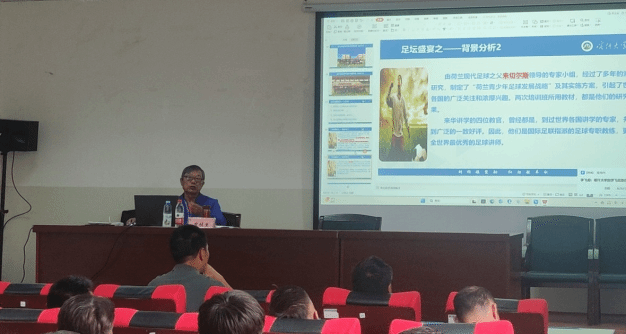 6月1日,为落实体育学院党委关于深入开展学习贯彻习近平新时代中国特色社会主义思想主题教育的方针政策,学院邀请了喀什大学银龄计划教师、兼教育部直属综合性大学体育协会副理事长,中国足协教练员岗位培训讲师及全国校园足球讲师曾桂生教授以《如何阅读足球比赛》为题进行了一场高质量的学术讲座。体育学院党委书记甘胜前教授主持会议,部分教师,本科生及研究生代表参会。