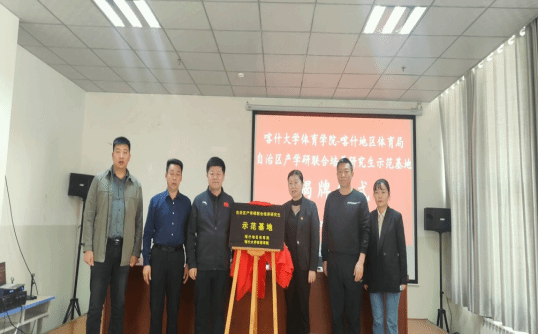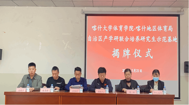 3月21日下午,喀什大学体育学院与喀什地区体育局举行“自治区产学研联合培养研究生示范基地”揭牌仪式。喀什地区体育局党组书记樊庆元,群体科长宋林军,喀什大学体育学院党委书记甘胜前,党委副书记、院长隋红,副院长陈志强,研究生处培养管理科科长任红梅,体育学院硕士生导师、教师代表参加了揭牌仪式。会议由喀什大学体育学院党委书记甘胜前主持。樊庆元书记和隋红院长作为双方代表为自治区产学研联合培养研究生示范基地揭牌。