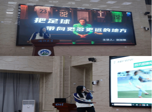 中国女子足球运动员赵丽娜以《把足球带向更多更远的地方》为题发表演讲。演讲伊始,声情并茂地讲述自己的足球生涯历程,分享每个不同时期的自己对于足球的理解,在努力过程收获的感悟,最终探寻到足球的意义何为。通过一个眼含热泪、热血沸腾的中国女足亚洲杯夺冠视频,引领全场观众重温女足荣耀时刻。她表示,通过此次记录,不仅体悟到个人也可以用镜头去记录一些有重大意义的人和事,更是感受到互联网时代媒体传播的磅礴力量,自己或许可利用镜头去探赜另一个更好的自己。时间追溯至2022年7月,她在喀什色满乡小学探访并成立了一支女足球队,色满乡小学的离别故事,让去到100所学校的目标在心底生根萌芽。今年4月退役后,为助力乡村少年足球梦,联合中国足球发展基金会、字节跳动公益平台,“星球计划”足球公益项目应运而生,致力于乡村偏远的地区小学足球的推广普及。同时对现场的学生发出志愿者邀约,邀请他们以志愿者身份加入项目中来,去学校给孩子们上足球课,分享自己的足球故事。最后,她总结到,人生的每个阶段有不同的风景,缩小受过的挫折,放大自己的闪光点,成为光,敢于尝试未曾做过的事,寻找属于自己的人生轨迹并坚定的执行和走下去。