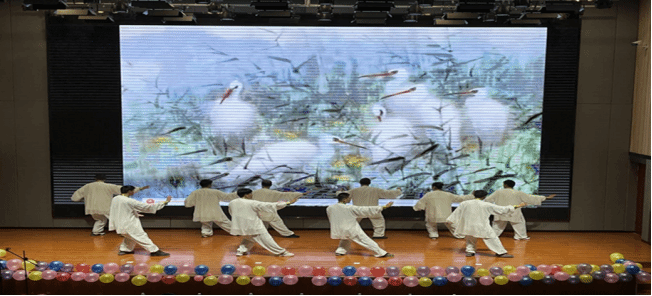 首先登场的是太极拳表演,由学院领导、银龄教师和中青年教师组成的10人太极拳表演方阵,他们身着白色太极服,动作整齐划一、舒展大方、刚柔并济,展示中华瑰宝太极拳韵味和魅力。