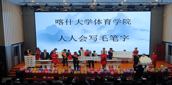 第三个登场的是人人会写毛笔字,由我院银龄教师、老中青教师挥毫泼墨,他们书写一幅幅催人奋进的诗句:“为党育人、为国育才”、“党旗所指,团旗所向,请党放心,强国有我”铿锵誓言和无悔承诺,“万里援疆支教路,初心不改育桃李”银龄教师的援疆情怀,“胡杨般坚韧、红烛般奉献”喀大校训、“体育学院发展有我”奋斗宣言,“更快!更高!更强!更团结!”奥林匹克精神、“长风破浪会有时,直挂云帆济沧海”奋斗精神等书法作品,他们的笔法刚劲有力,既展现了中华传统文化的独特魅力,又彰显了体育学院教师为人师表的书法功底,也展示了温文尔雅的文人风华。